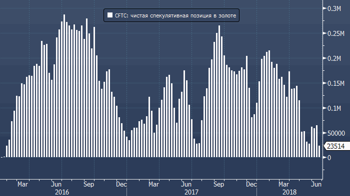 С начала торгов во вторник, 26 июня, стоимость тройской унции в мире теряет 0,8% и достигала уровня $1250. Согласно последним данным американской Комиссии по торговле товарными фьючерсами (CFTC), за неделю до 19 июня чистая длинная спекулятивная позиция во фьючерсах и опционах на золото сократилась к 2-летнему минимуму. Несмотря на опасения торговой войны GOLD продает. Почему? Давайте рассуждать.